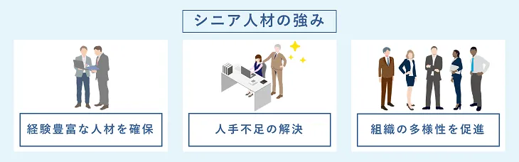 シニア人材のスキルを活用することは、労働力の補強だけでなく、組織にとってさまざまなメリットがあります。ここでは、シニア人材の強みを紹介します。