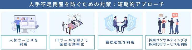 現場の我慢には限界があり、人手不足倒産を防ぐためには即効性が期待できる対策を打つ必要があります。即効性がある短期的なアプローチを解説します。