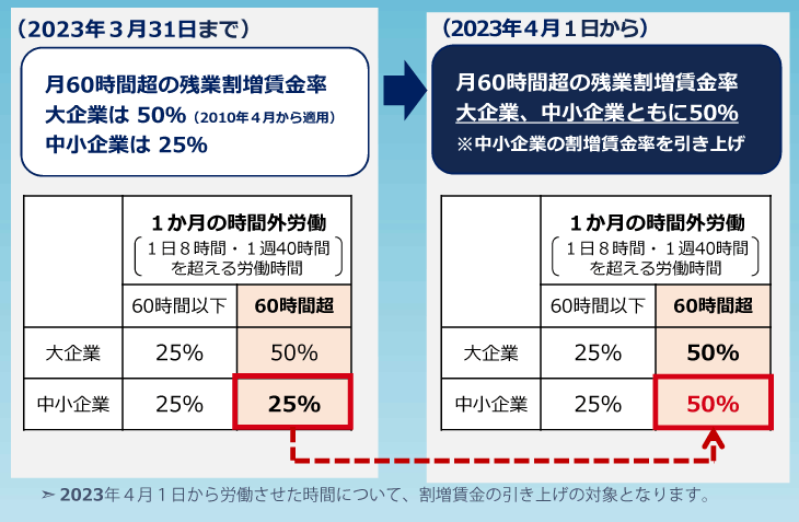 大企業では2010年4月から改正が行われている時間外労働の割増賃金率の引き上げについて、2023年4月以降は中小企業に対しても義務化されます。
