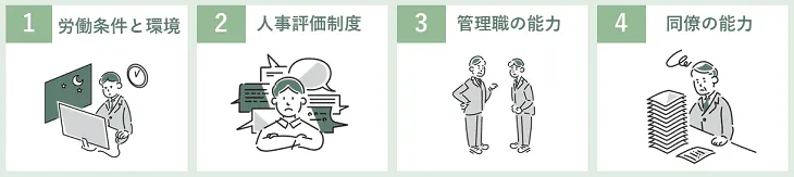 職場環境とは、職場の内装や机やその配置、照明の明るさ、PC周りといった物理的な環境に加え、職場の上司やメンバー、関係先などの働く上での人間関係も大きな課題になります。